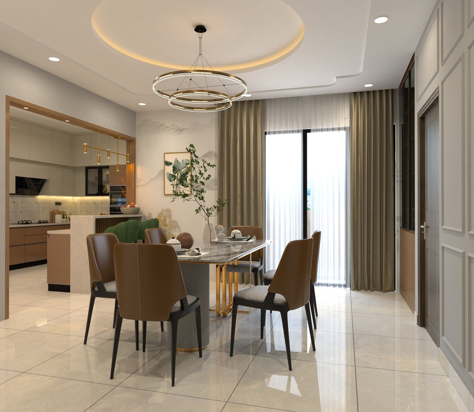 Material harmony is equally important. Coordinating flooring, wall textures, and ceiling details strengthens the interior design language of the dining area.